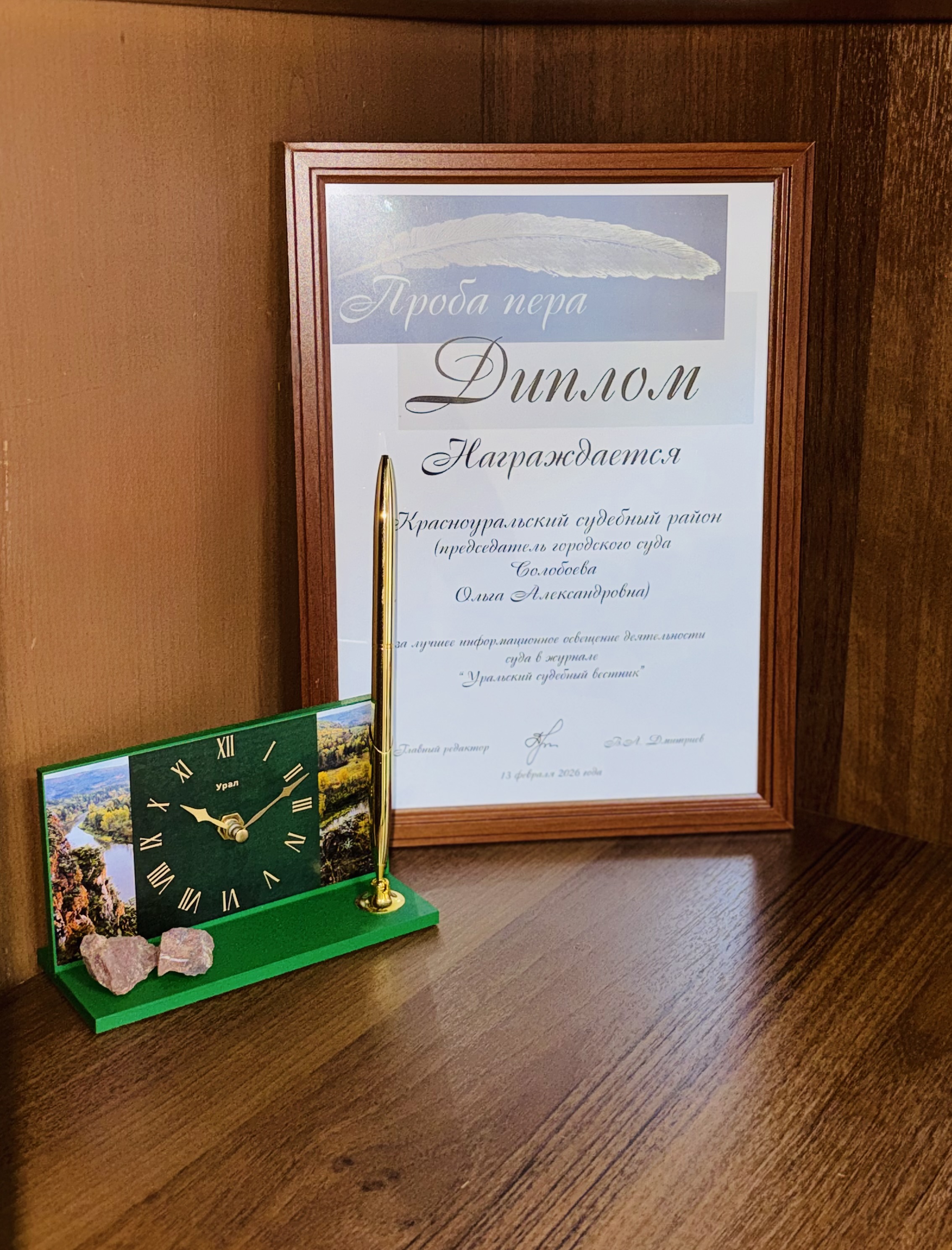 В минувшую пятницу при подведении итогов работы судов в 2025 году призом «Проба пера» и дипломом журнала «Уральский судебный вестник» за лучшее информационное освещение деятельности суда по итогам 2025 года награжден коллектив Красноуральского городского суда. Журнал выходит 3 раза в год, в издании размещаются материалы о судебной системе, передовых технологиях, о судьях, работниках судов, знаменательных событиях и фактах. Поздравляем коллектив суда с победой! ![]() |